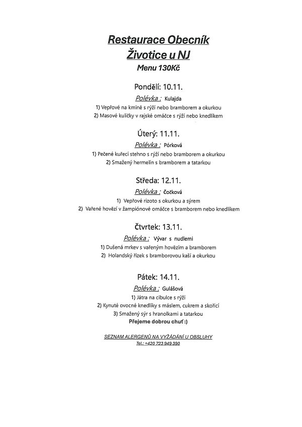 Restaurace OBECNÍK - jídelní lístek od 10.11. 2025 - 14.11. 2025